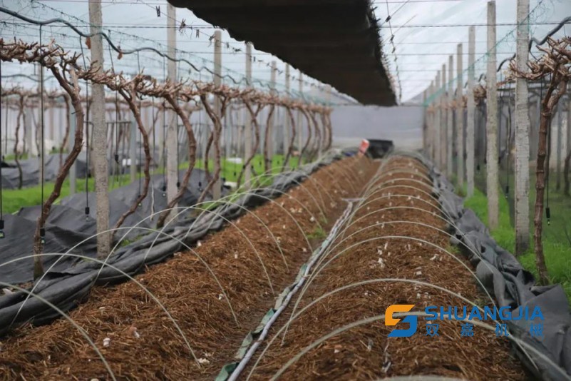 葡萄套種大球蓋菇技術(shù)以玉米、稻草等農(nóng)作物秸稈、葡萄枝條等農(nóng)業(yè)廢棄物作為栽培原料,按照一定比例混合并進行20天左右堆料,按照既方便大球蓋菇操作又不影響葡萄冬季管理的原則,在葡萄架下設置種植畦,將菌種植入其內(nèi),通過控溫保濕和滅菌管理,40天后就可以出菇。