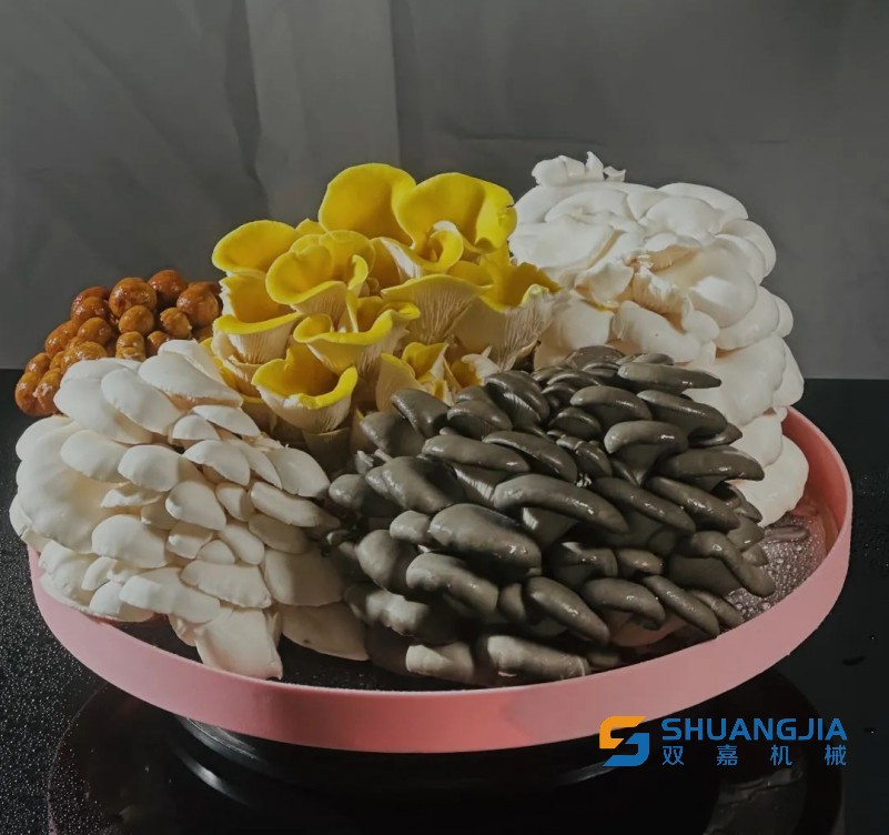 技術(shù)人員主要開(kāi)展了4項(xiàng)工作,一是從眾多品種中集齊了黑色、灰色、白色、黃色和紅色五種顏色;二是從200多個(gè)大類(lèi)品種中,根據(jù)溫型、菇型、色澤引進(jìn)了16個(gè)品種,最終選擇了5個(gè)代表性品種;三是采取了分期制棒的措施,確保不同品種同時(shí)完成發(fā)菌;四是集中出菇,通過(guò)綜合環(huán)境的調(diào)控,達(dá)到同時(shí)上市的目的。