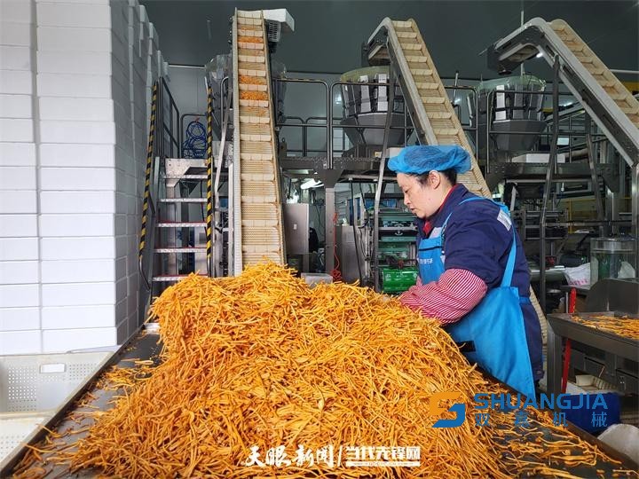 走進(jìn)工廠,只見(jiàn)數(shù)十臺(tái)自動(dòng)化設(shè)備有序運(yùn)轉(zhuǎn),一袋袋包裝精美的蟲(chóng)草花經(jīng)過(guò)裝盆、滅菌、接種、培養(yǎng)、出菇、包裝等工序后發(fā)往川渝、兩廣及海外市場(chǎng)。